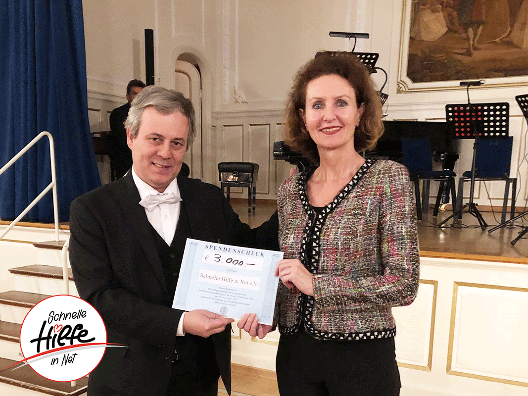 Am 20.11.2018 fand das Traditionelle Wohltätigkeitskonzert der Freimaurerloge Sokrates in Frankfurt statt. In diesem Rahmen werden jedes Jahr gemäß der in der Logensatzung festgelegten karitativen Aufgaben verschiedene gemeinnützige Vereine mit Spenden bedacht. In diesem Jahr wurde die Schnelle Hilfe in Not e.V. ausgewählt und durfte sich über eine großzügige Spende in Höhe von 3.000€ freuen. Dieter Miers der Loge Sokrates überreicht den Scheck an Sigrid Metzler.